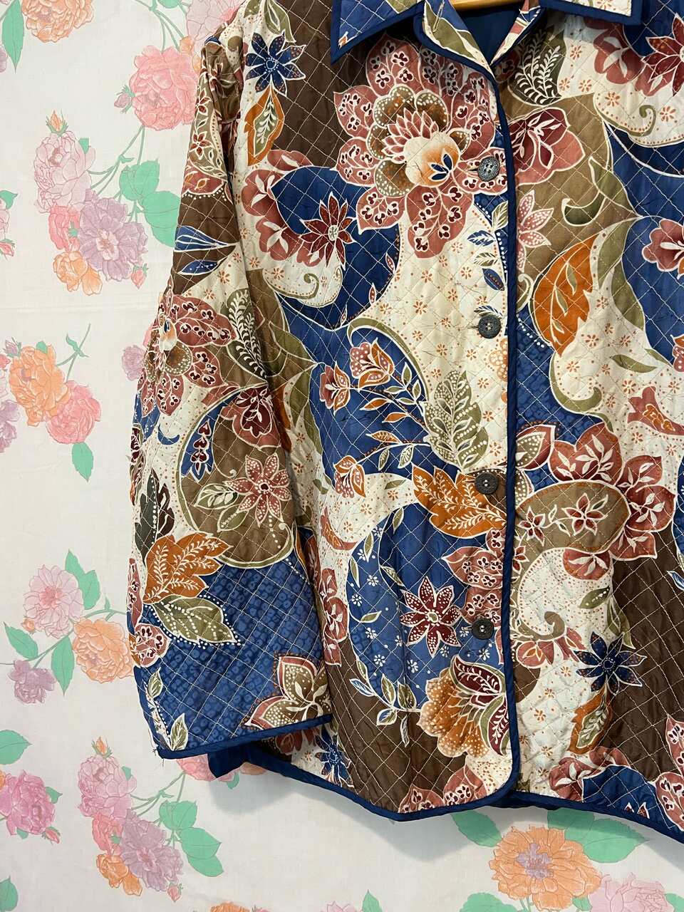 Floral paisley quilted satin jacket with button closure. Boho and cottagecore inspired. Lightweight! Size XL, in excellent vintage condition.