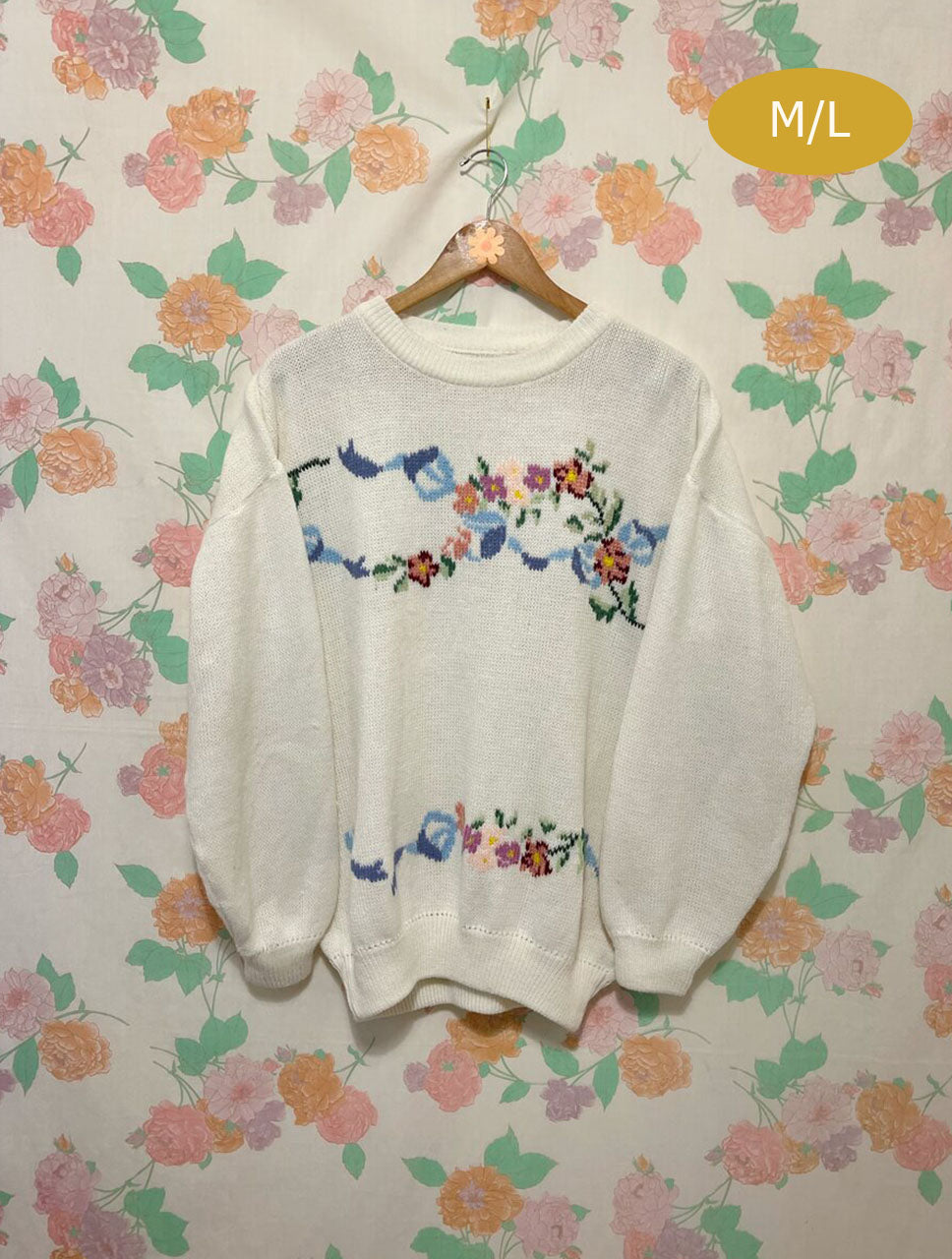 Vintage sweater with colorful floral embroidery across the front. Cozy and oversized.