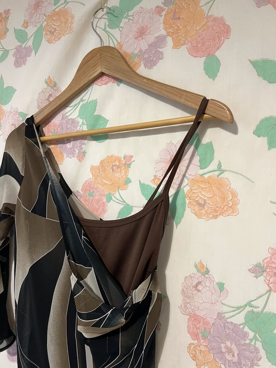 Stretchy long-sleeve dress with geometric swirl prints in beige, brown and navy tones. In excellent condition.
