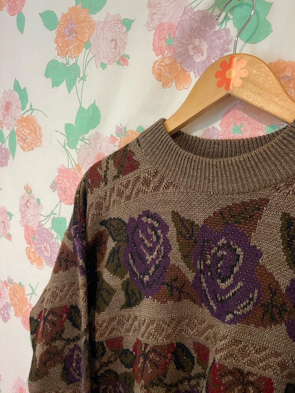 Wool sweater with floral and geometric pattern in muted tones. Oversized fit and mid to heavyweight.